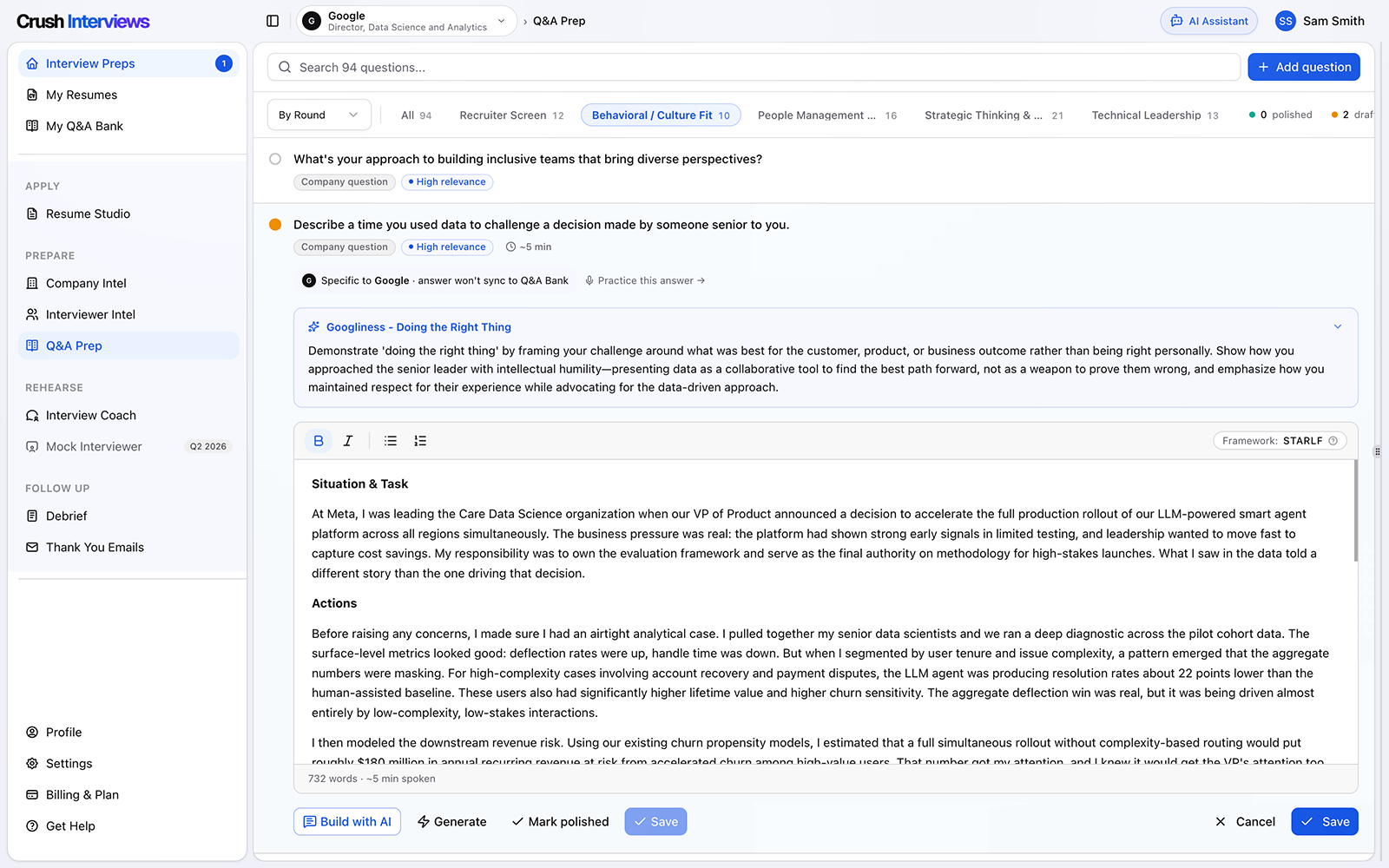 AI-powered interview preparation for senior professionals. Resume analysis, company & interviewer intelligence, compounding Q&A bank, and voice-enabled interview practice engineered for executives interviewing at $300K–$2M+ roles.